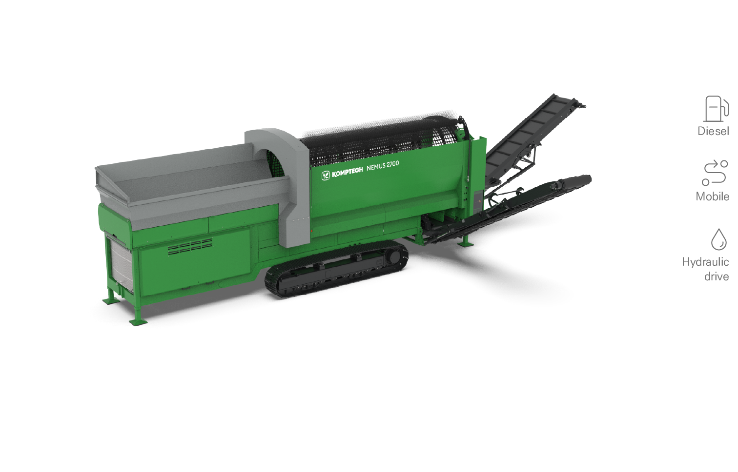 대형 경사형 호퍼와 개선된 투입 구조의 스크린 드럼, 고성능 배출 시스템은 디젤-유압식 구동과 조화를 이루며 안정적인 성능을 제공합니다.