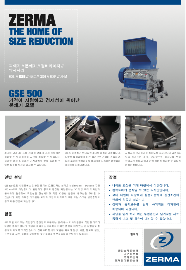 완전하게 용접된 커팅챔버는 "V"타입의 로터 디자인과 완벽하게 결합하여 작업성을 향상 시키고 단단한 내구성으로 다양한 활용성을 보여주고 있습니다. 외부 하우징 디자인은 회전날과 고정날의 손쉬운 교체를 가능하게 해주며 스크린 또한 쉽고 빠른 접근으로 교체가 가능하도록 해줍니다.