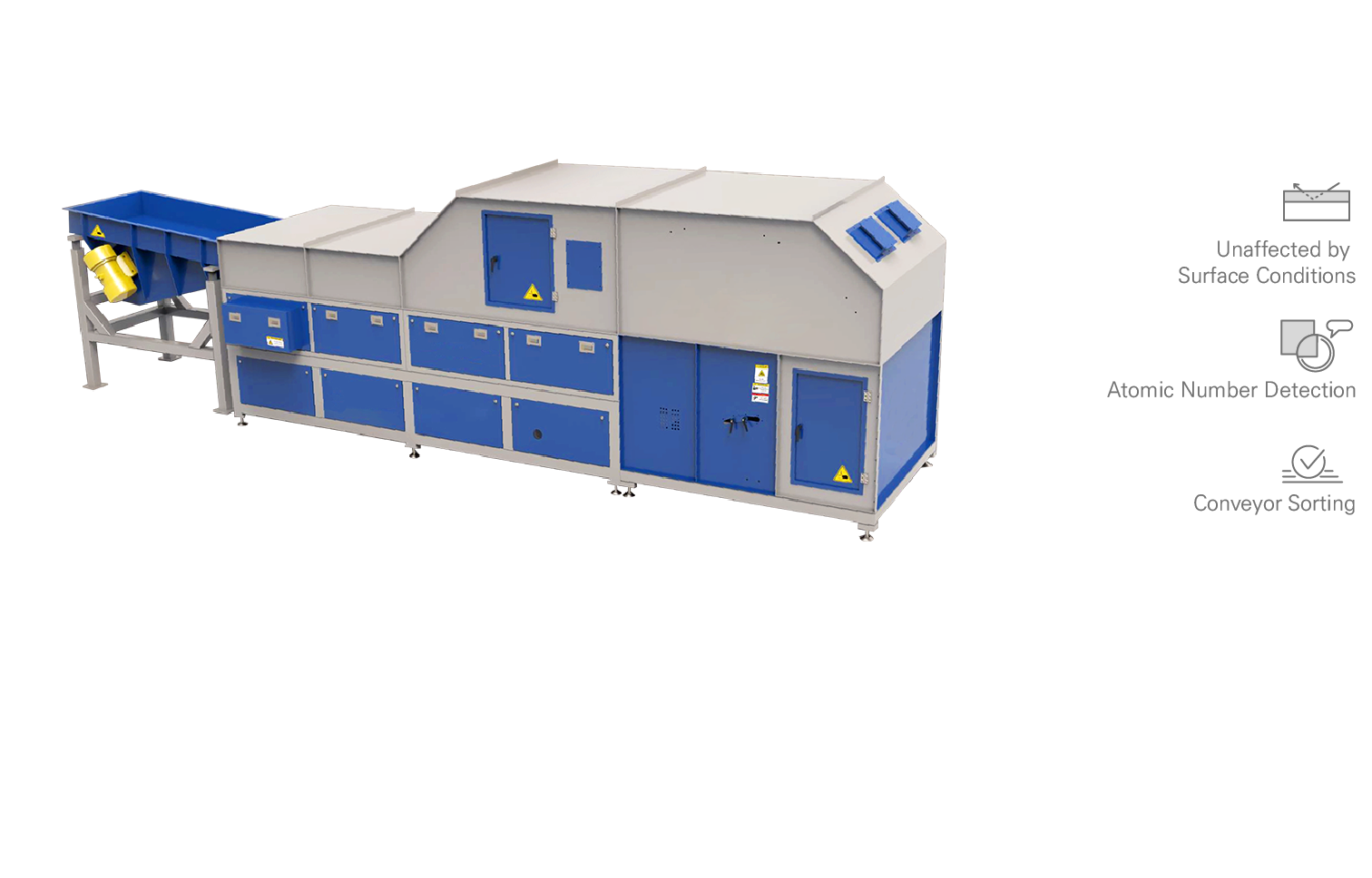 물질은 컨베이어 벨트를 통해 이동하고, X-ray 선별기는 물질의 표면 특성인 색상, 먼지 및 기타 오염과는 무관하게 물질을 식별합니다.