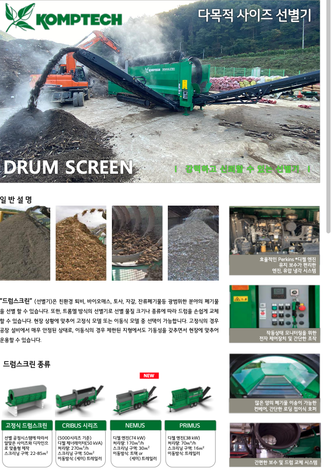 트롬멜 방식의 선별기로 선별 물질 크기나 종류에 따라 드럼을 손쉽게 교체할 수 있으며, 특수 설계된 드럼으로 높은 처리량을 보장합니다.